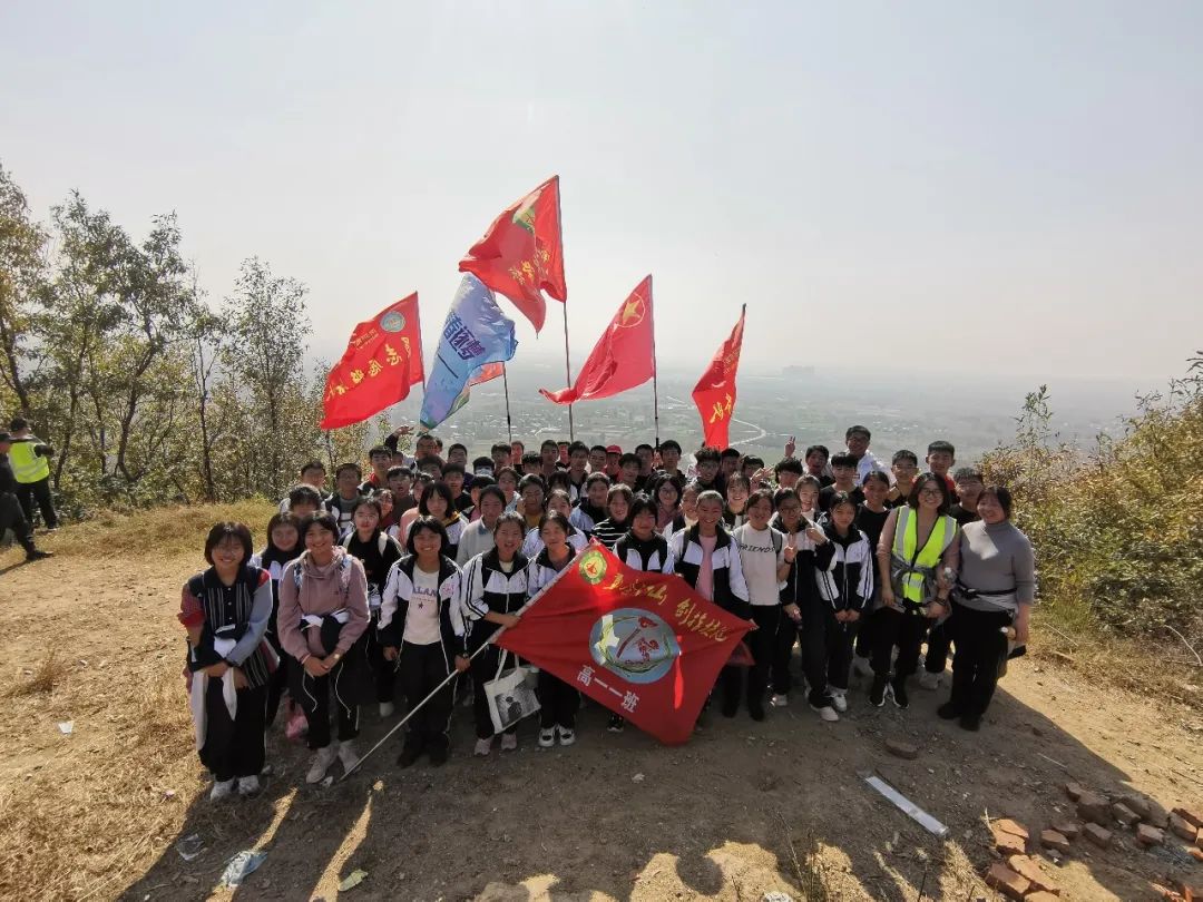 雖已深秋,驕陽依然烈如火,師生們砥礪志彌堅。磨山越來越近了,同學(xué)們打著班旗,唱著班歌,喊著口號,精神抖擻,伴著風(fēng)景向前進(jìn)發(fā)。