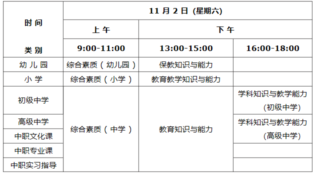 ?。ㄋ模┤珖y(tǒng)一考試日期11月2日,各類別考試科目與時間安排如下: